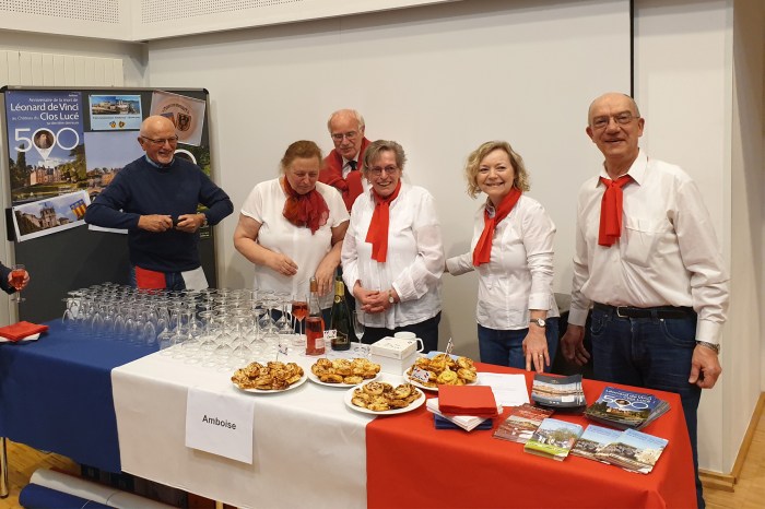 Mit Postern, Infomaterial und einer Diashow wurde die Stadt Amboise in der bis auf den letzten Platz besetzten Stadthalle vorgestellt. Natürlich wurden den Musikliebhabern auch zwei tolle Weine aus Amboise angeboten. Das Orchester begeisterte mit seiner Darbietung von französischen Klassikern wie „Non, je ne regrette rien“, „La vie en rose“ et „Les Champs-Elysées“.