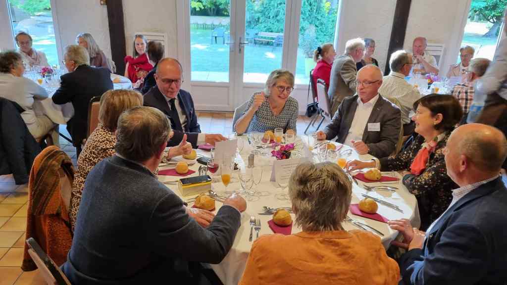 Trotz der langen Fahrzeit herrschte im Bus von Beginn an eine sehr entspannte und freundschaftliche Atmosphäre, die getragen wurde von der Vorfreude auf das lang ersehnte Wiedersehen. So war dann auch der Empfang durch die französischen Gastgeber in der Amboiser Weinbauschule besonders herzlich. Bei einem Gläschen Wein und kleinen Häppchen gab es nach so langer Zeit viel zu erzählen. Und in ihren kurzweiligen Begrüßungsworten brachte die französische Vorsitzende Beatrix Peter ihre Freude zum Ausdruck, dass nun endlich – mit 2 Jahren Verspätung – das für 2020 geplante 35jährige Jubiläum der Partnerschaft gefeiert werden konnte. Selbstverständlich wurde in diesem Zusammenhang auch einiger Gründungsmitglieder von beiden Seiten gedacht, die leider schon verstorben sind oder aus gesundheitlichen Gründen nicht mehr an den Treffen teilnehmen können. Anschließend skizzierte sie kurz das vorgesehene Programm, und der Abend klang in den gastgebenden Familien aus.
