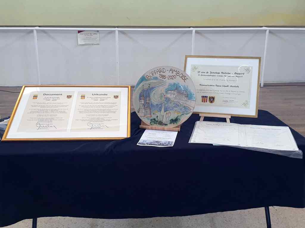 Gekrönt wurden die interessanten und abwechslungsreichen Geschehnisse des Tages durch ein festliches Abendessen im „Les Laurières“, einem Restaurant mit stilvollem Ambiente in einer kleinen Parkanlage in St. Martin-Le-Beau. Das viergängige Menü und die passenden Getränke ließen keine Wünsche offen und sorgten für eine stimmungsvollen und entspannten Abend. Begleitend dazu unterhielten uns drei junge Chansonsängerinnen mit ihrem wohlklingenden Gesang. Und die beiden Vorsitzenden, Beatrix Peter und Erika Bergmann, ließen mit passenden Worten noch einmal kurz die nunmehr 37jährige Geschichte dieser Partnerschaft Revue passieren. Besondere Beachtung fand dabei das Gastgeschenk für unsere französischen Freunde – eine großer Keramikteller, den die Bopparder Künstlerin Susanne Bartram schon 2020 anlässlich des 35jährigen Jubiläums gestaltet hatte und der für Amboise das Schloss mit der Loirebrücke sowie für Boppard die Basilika St. Severus zeigt, symbolisch verbunden durch Loire und Rhein mit den Rebstöcken als Zeichen der jeweiligen hervorragenden Weinkultur. So konnte man voller herrlicher Eindrücke den Heimweg in die Familien antreten.